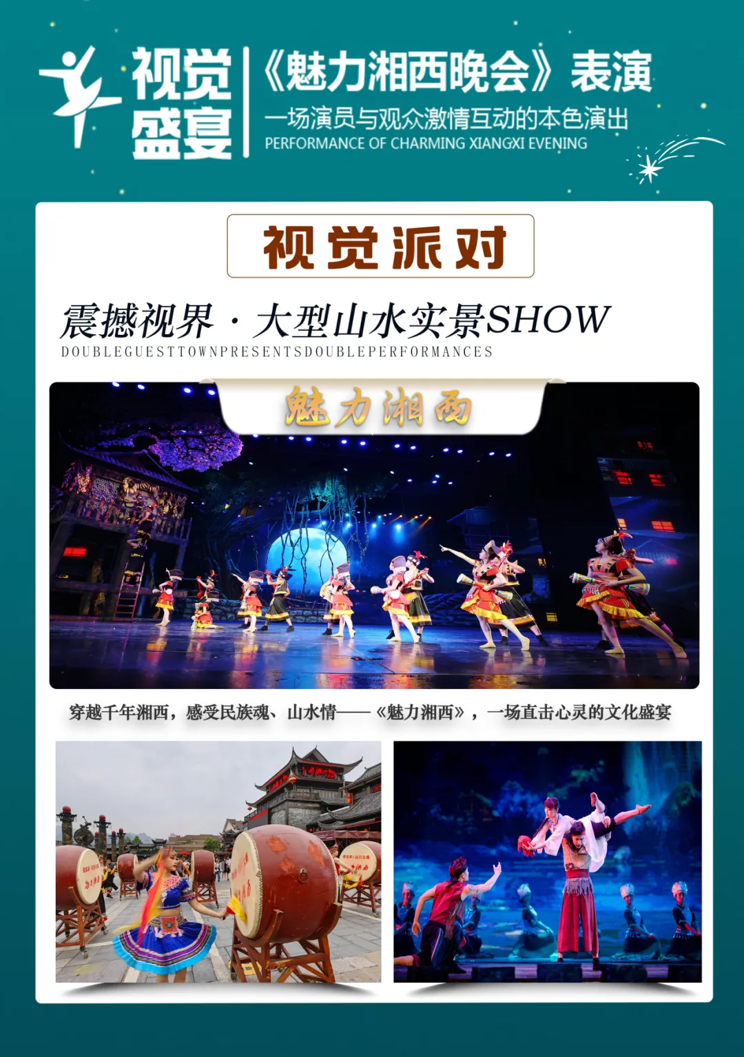 晚上赠送观演大型歌舞表演——《魅力湘西》(约1.5小时):此晚会由著名导演张艺谋担任导演,刘欢担任音乐监制,非物质文化遗产基地,神秘大湘西的文化盛宴,解读大湘西神奇、神秘的巫傩文化。代表中国艺术全世界巡回演出,受到至尊礼遇,引起国际轰动,让世界重新认识中国,艺术中国、文化中国、魅力中国,见证了民族的,才是世界的!最古老的火鼓惊艳;最浪漫的追爱爬楼;最神秘的湘西赶尸;最真情的哭嫁感恩。(此为赠送晚会,根据票务情况,可能更换成同等价值的《千古情》剧场,无退费请谅解)
