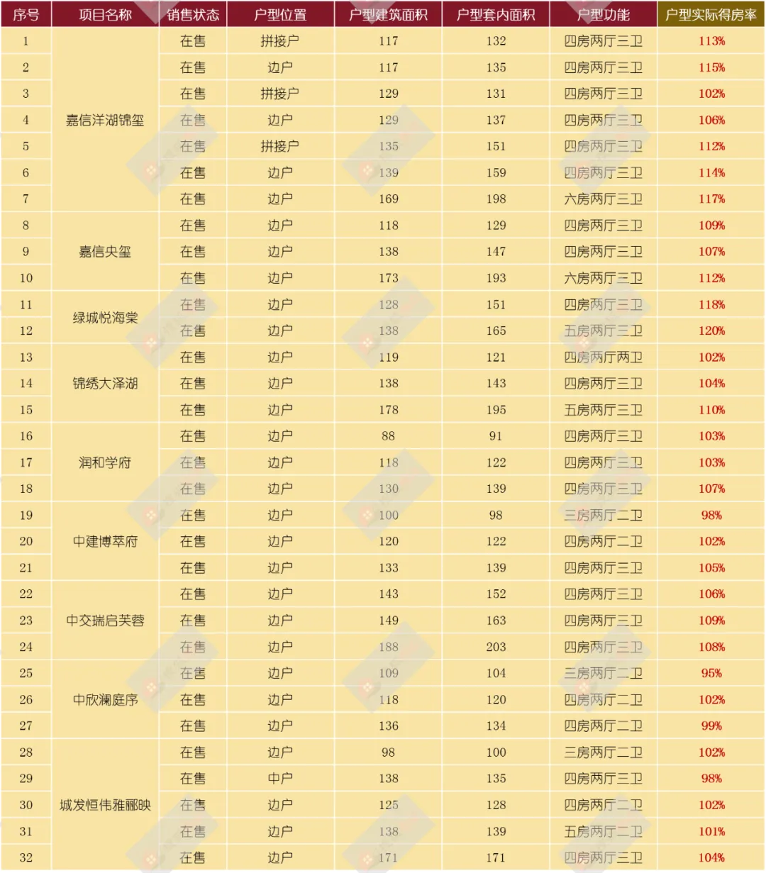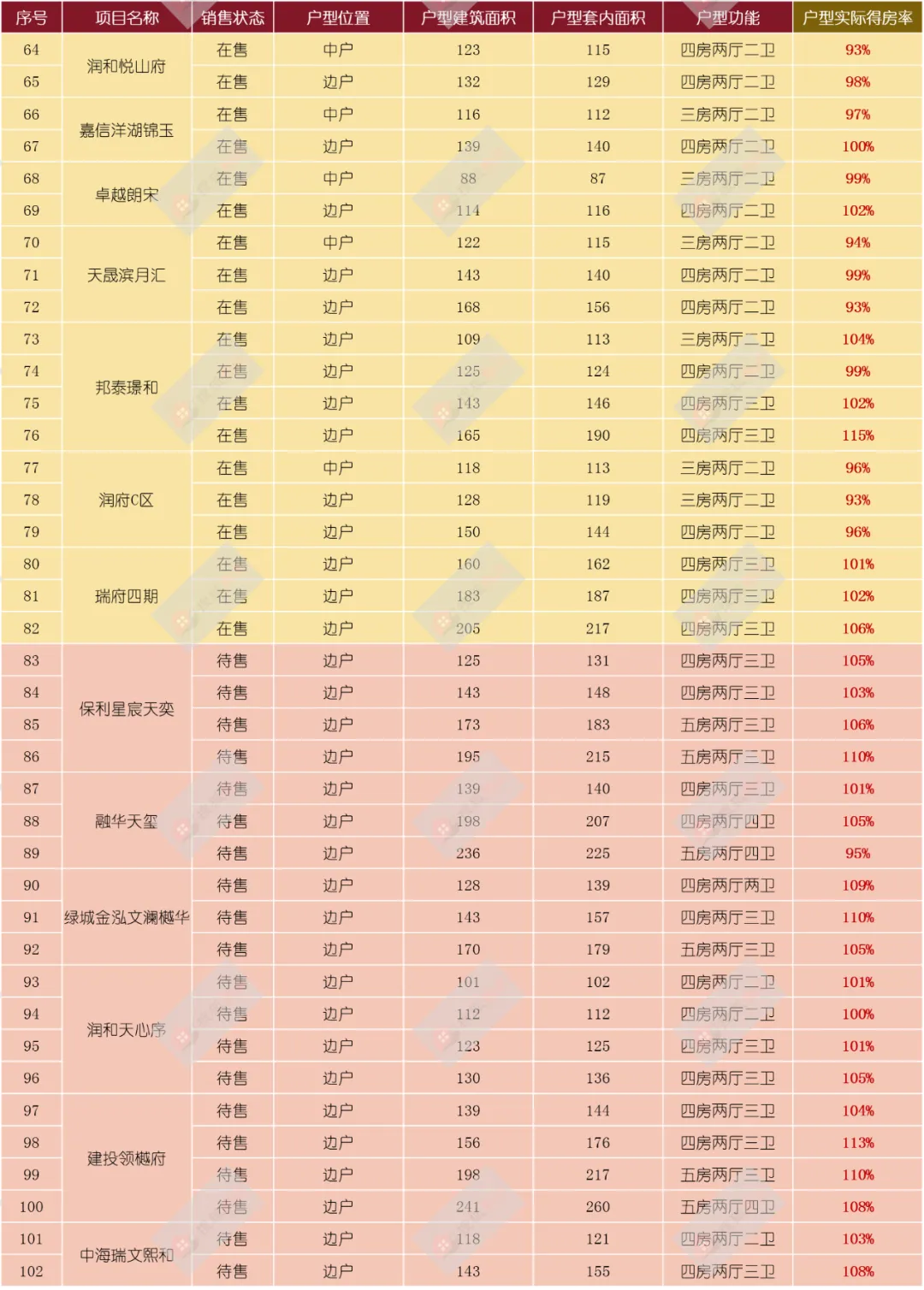 根据102个新规户型得房率统计:在售项目平均实际得房率103%,待售项目105%。