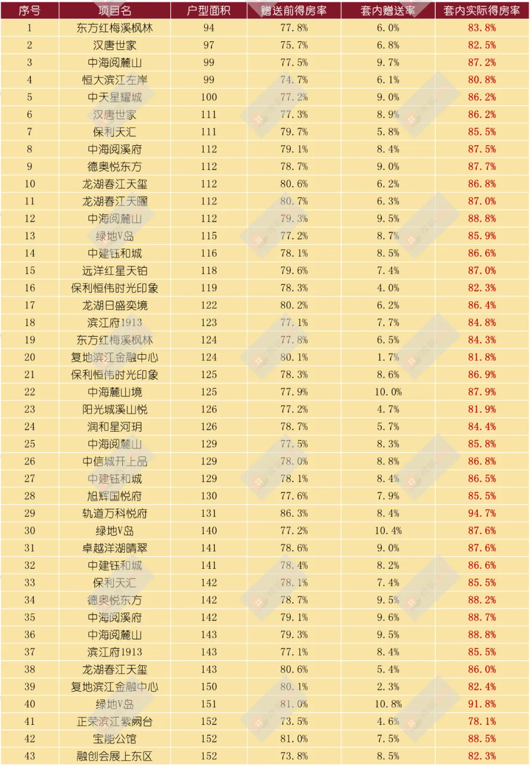 115%以上的超高得房率户型已成稀缺品,遇到这类产品可以重点关注。